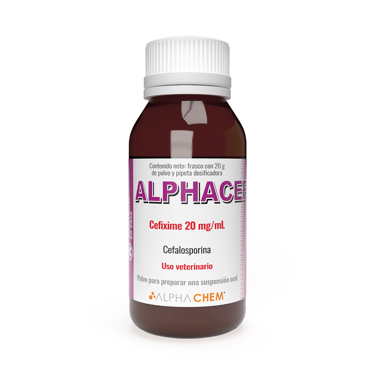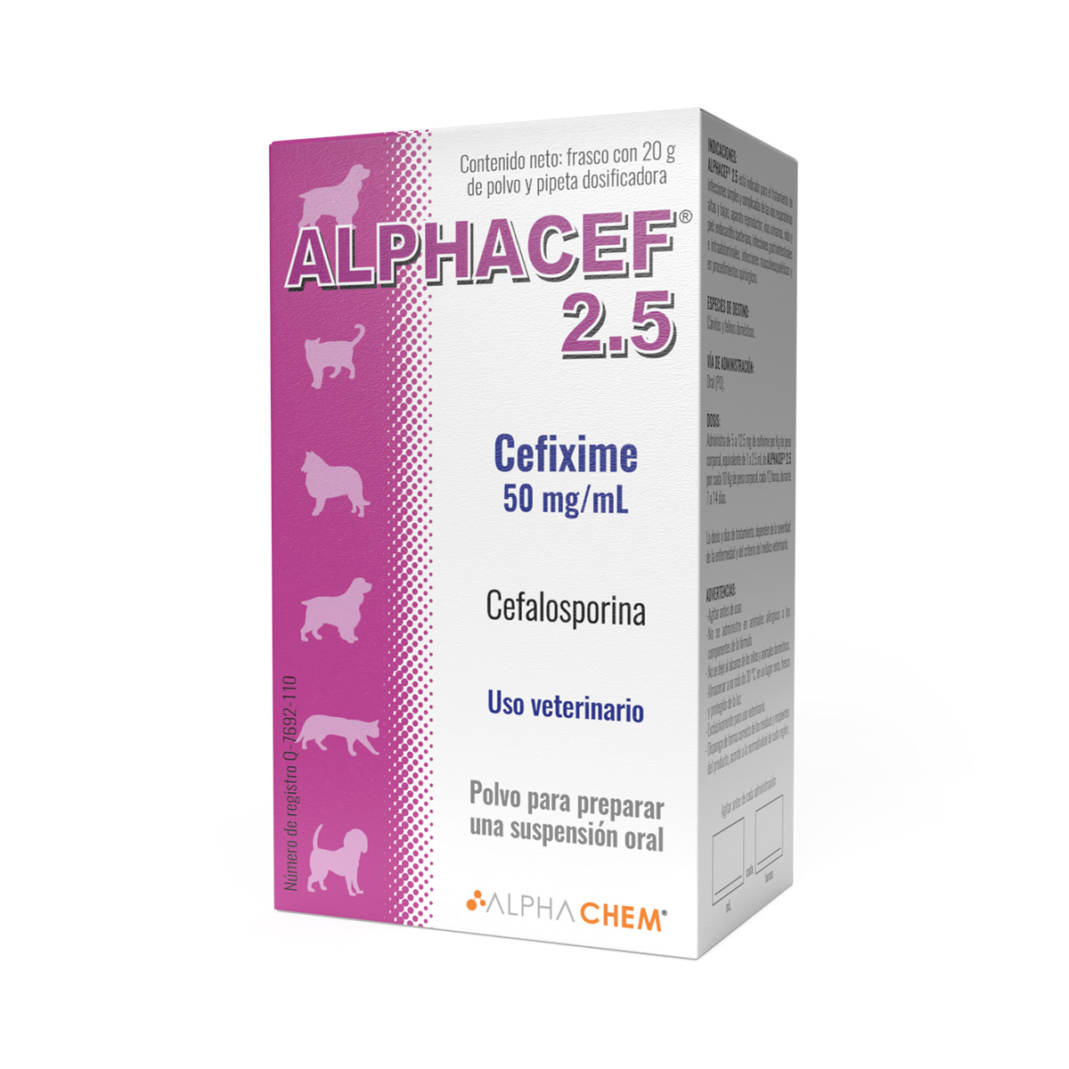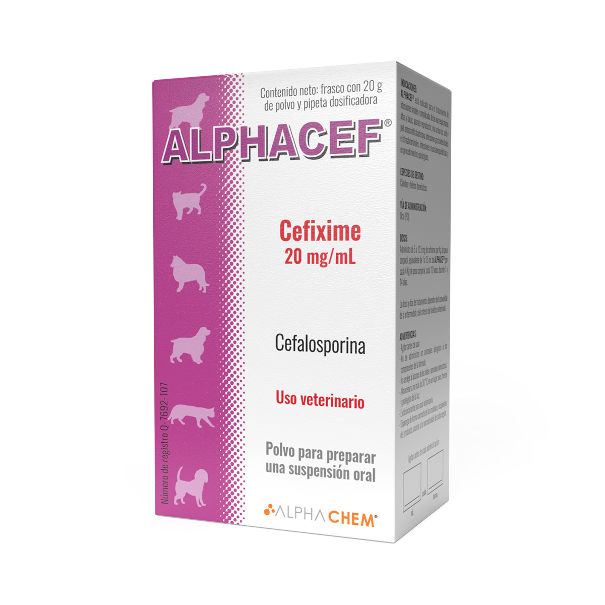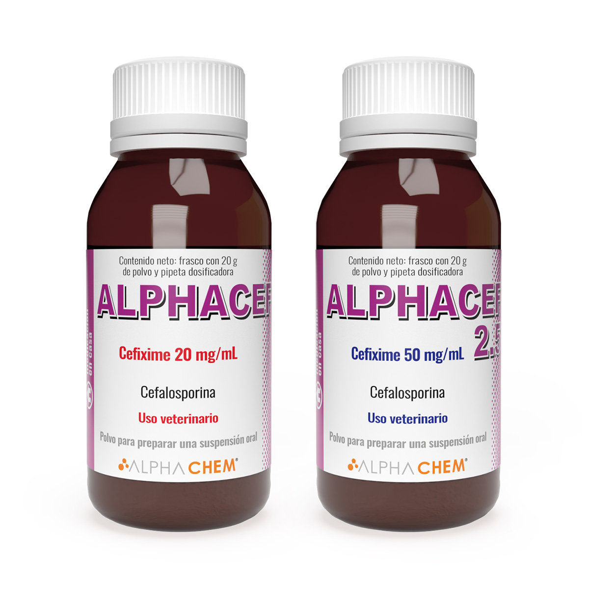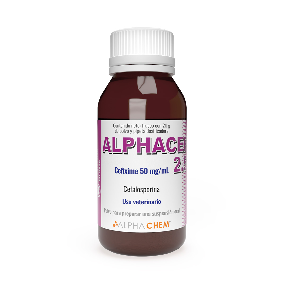 | DOSIS: | ALPHACEF® 1 g Cánidos y felinos domésticos, para infecciones sistémicas administrar de 10 a 12.5 mg de cefixime por kg de peso corporal, equivalente de 2 a 2.5 mL de ALPHACEF® por cada 4 kg de peso, cada 12 horas durante 7 a 14 días. Para infección del tracto urinario, administrar 5 mg de cefixime por kg de peso corporal, equivalente a 1 mL de ALPHACEF® por cada 4 kg de peso corporal, cada 12 a 24 horas, durante 7 a 14 días. ALPHACEF® 2.5 g Cánidos y felinos domésticos, para infecciones sistémicas administrar de 10 a 12.5 mg de cefixime por kg de peso corporal, equivalente de 2 a 2.5 mL de ALPHACEF® 2.5 por cada 10 kg de peso, cada 12 horas durante 7 a 14 días. Para infección del tracto urinario, administrar 5 mg de cefixime por kg de peso corporal, equivalente a 1 mL de ALPHACEF® 2.5 por cada 10 kg de peso corporal, cada 12 a 24 horas, durante 7 a 14 días. La dosis y días de tratamiento, dependen de la severidad de la enfermedad y del criterio del Médico Veterinario. Con la finalidad de preservar la calidad terapéutica de ALPHACEF® y ALPHACEF® 2.5 se sugiere que la terapia se lleve a cabo de manera responsable y controlada. |