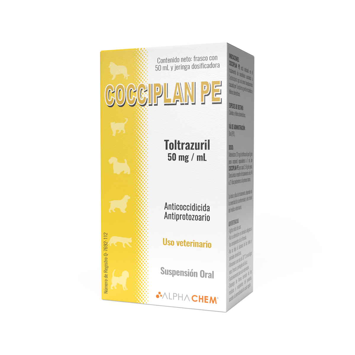 | INDICACIONES TERAPÉUTICAS: | Coccidiosis Los coccidios son parásitos protozoarios intracelulares obligados que se encuentran comúnmente en el tracto gastrointestinal de perros y gatos. Las infecciones más comúnmente diagnosticadas en perros son Cystoisospora (sinónimo Isospora) canis y Cystoisospora ohioensis-complex (C. ohioensis + Cystoisospora burrowsi), mientras que Cystoisospora felis y Cystoisospora rivolta predominan en el gato. La transmisión se produce a través de la ruta fecal-oral o por la ingestión de los tejidos infectados de un huésped (ratones, ratas, hámsteres y otros vertebrados; Companion Animal Parasite Council, 2014), y la tasa de infección es más alta en entornos saturados y/o insalubres. La coccidiosis suele ser una enfermedad de cachorros y gatitos menores de 6 meses de edad y la recurrencia del parásito es rara en animales mayores de 1 año de edad. Toxoplasmosis Las infecciones por Toxoplasma gondii pueden adquirirse por vía transplacentaria, a través de la ingestión de carne cruda que contiene organismos enquistados, o a través de la ingestión de alimentos o agua contaminados por ooquistes. La mayoría de las infecciones son asintomáticas. Los gatitos infectados por vía transplacentaria pueden desarrollar signos agudos fulminantes oculares, hepáticos, pulmonares y del sistema nervioso central (SNC). La enfermedad en animales de mayor edad, resulta de la reactivación de una infección crónica enquistada. La infección es evidente en los pulmones, el SNC, los músculos, el hígado, el páncreas, el corazón y en los ojos en gatos y perros. El toltrazurilo es un fármaco antiprotozoario que se utiliza como coccidiostático y para tratar otras infecciones por protozoarios en animales. Es efectivo contra Cystoisospora spp (Isospora spp), Toxoplasma gondii y Eimeria spp. El toltrazuril se ha utilizado en cachorros y gatitos para tratar infecciones intestinales por protozoarios. Para el tratamiento de infecciones por coccidios en gatitos se indica una dosis de 30 mg/kg una vez o 15 mg/kg una vez al día durante 3 días y repetir nuevamente 10 días después. También se ha utilizado para tratar la etapa de eliminación de ooquistes de la toxoplasmosis en gatos. Se ha administrado con éxito en cachorros a dosis de 10, 20 o 30 mg/kg, durante 4 semanas. COCCIPLAN PE está indicado en el tratamiento de coccidiosis asociadas a Cystoisospora spp; así como Toxoplasmosis causada por Toxoplasma gondii en cánidos y felinos domésticos. |